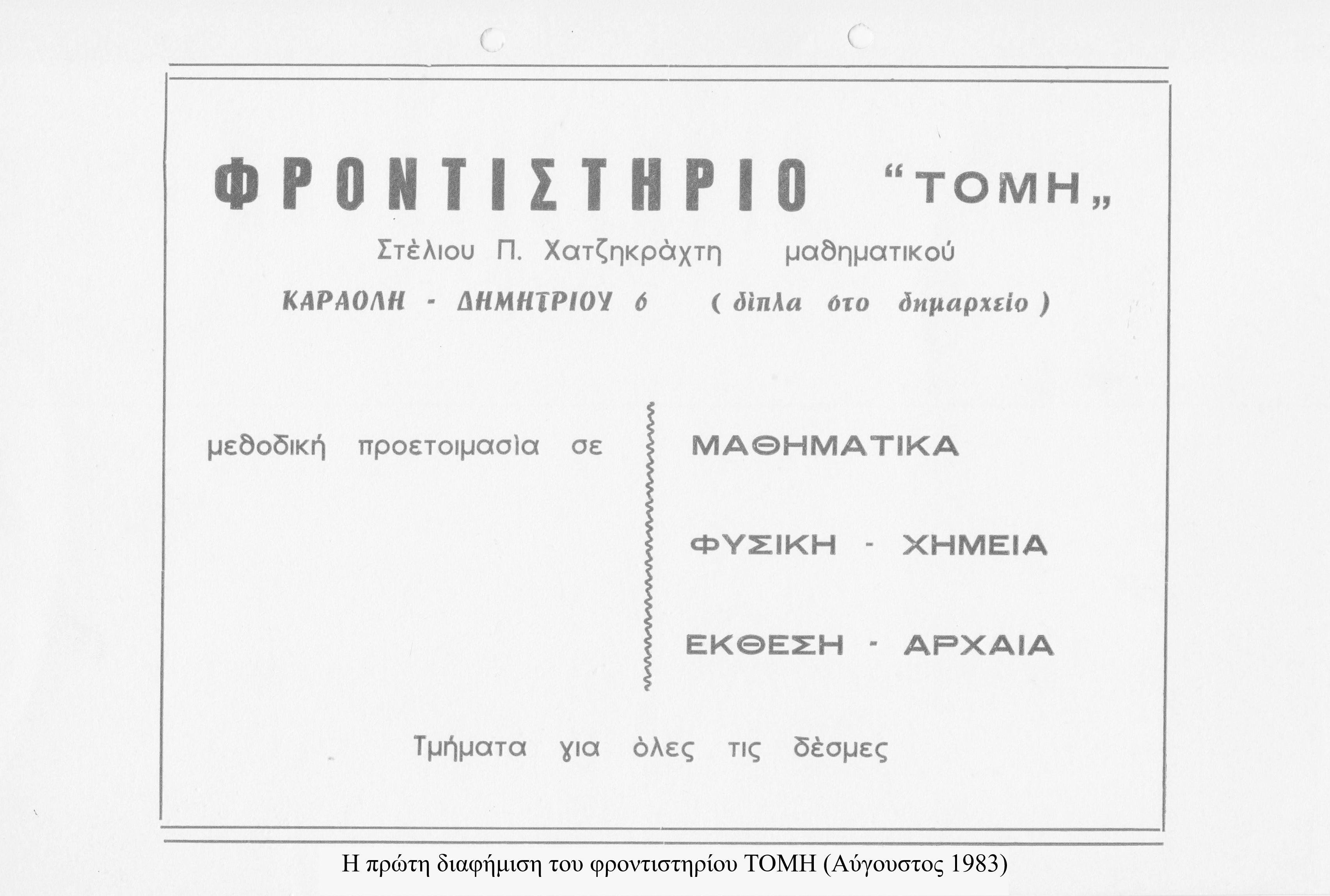 - Το 1983 με το ξεκίνημα της λειτουργίας του, το φροντιστήριο «ΤΟΜΗ» πρωτοπορεί για τα φροντιστηριακά δεδομένα της πόλης εκδίδοντας σημειώσεις που διανέμονται δωρεάν στους μαθητές του.