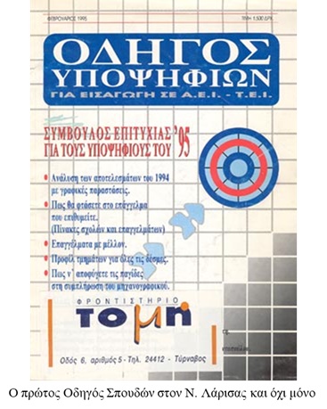 - Το 1995 διανέμει δωρεάν τον πρώτο Οδηγό Σπουδών στους μαθητές, μια ενέργεια πρωτόγνωρη για τα εκπαιδευτικά δεδομένα του Νομού Λάρισας και γενικότερα της περιφέρειας.